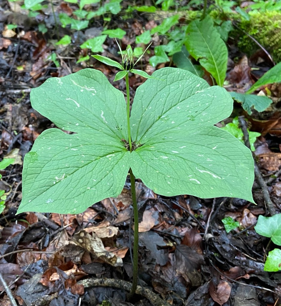 She had been on the path I now took, (checking it successfully on the preloaded route on the Swisstopo app — triumph!), which curved with the fence of the river and climbed up into a long woodland. I stopped only to photograph Herb Paris for which I have been looking forever and have never seen (another triumph). It is pretty distinctive amongst the woodland undergrowth. I love the way the leaves are arranged in fours, and that all the parts of the seed head follow the quatrefoil pattern.