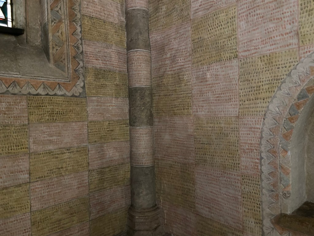 Around it the side walls and columns of the chancel were decorated with bands and rectangles of a pointilliste design.