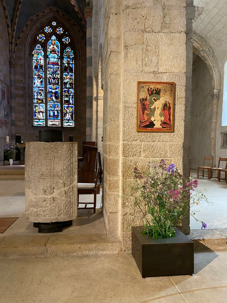 The main church felt familiar; perhaps it was the presence of familiar protestant church furniture: an organ, flower arrangements (here long-stemmed but short-lived wildflowers from the verges),